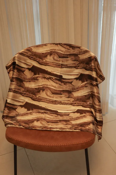 בנדנה אלגנטית ומיוחדת בגוונים טבעיים וחמים של חום, שמנת וקפה, המשתלבים יחד בהדפס אמנותי רך המדמה משיכות מכחול עדינות.